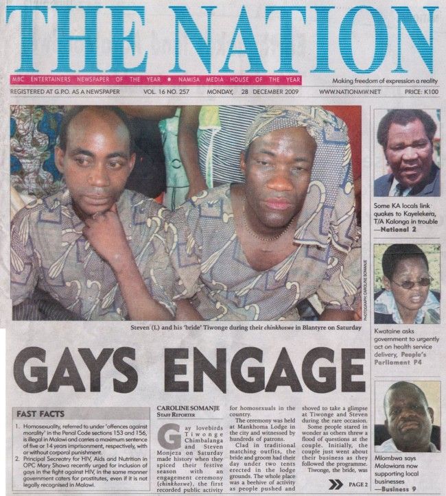 In Malawi's capital Blantyre, two gay men were each sentenced to 14 years in prison with hard labour yesterday. Tiwonge Chimbalanga and Steven Monjeza had celebrated their engagement in a church on 26 December 2009 and were arrested a short time later. They are said to have been tortured while in custody. They were charged with "consummation of homosexuality", which is punishable by severe prison sentences in Malawi.