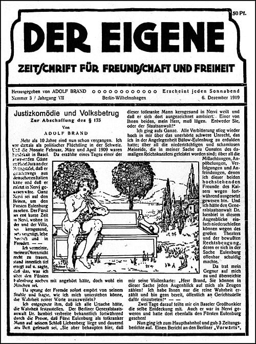 Despite his problematic ideological stance, Adolf Brand (1874-1945), co-founder and long-time director of the GdE, also made some contributions to queer emancipation. According to current knowledge, the magazine "Der Eigene", which he published irregularly from 1896, is the first homosexual magazine in the world, even if it was aimed at a more upscale (and implicitly male) readership. As "Der Eigene" often contained images of naked men and thus violated Section 184 (sale and distribution of "lewd" writings), Brand had to stand trial several times and even serve prison sentences. Incidentally, the "Jahrbuch für sexuelle Zwischenstufen", a scientific publication, was spared a similar fate.