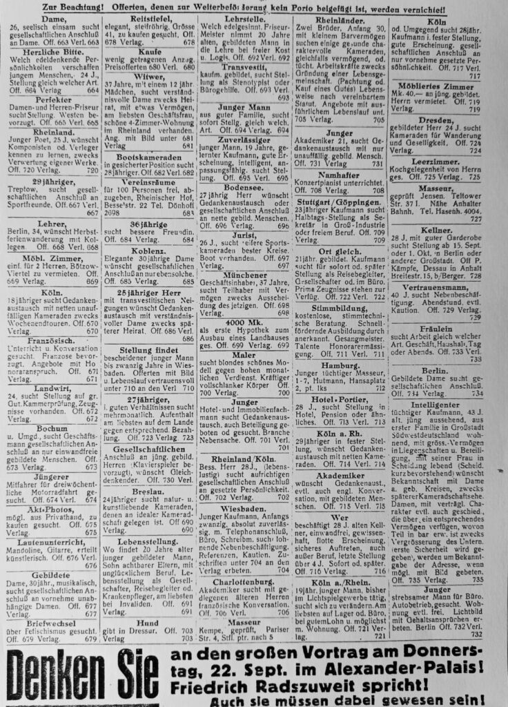 This time the offence was procuring. How was this charge justified? The decisive factor was the adverts, i.e. personal adverts, which encouraged queer people to get to know each other and possibly - according to the court's reasoning - also sexual contact. Consequently, they disappeared from the magazine and were now only available as part of a subscription to a separate extra sheet.