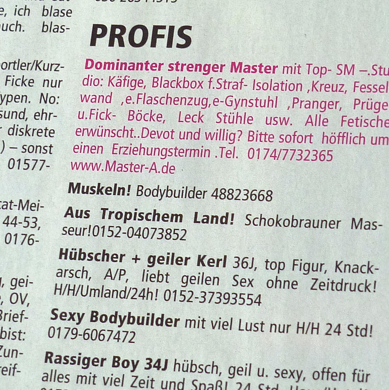 Thanks to the possibilities offered by the Prostitution Act, Tom is now part of the army of freelancers. While others offer their services as masseurs, journalists or IT technicians, Tom delivers sex. On request, free of charge or in his specially equipped studio. His tax office clerk has already got used to the fact that, in addition to the rent for the flat, he declares the expenses for relevant adverts in city magazines as well as for sex toys and lubricant as work-related expenses on his income tax return.