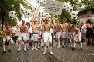 That's something else. (laughs) We don't wear skirts, just handbags. There is a famous example: a photomontage of the Argentinian national football team forming a wall. Someone had mounted handbags in the players' hands. We recreated this in real life. All our promotional postcards that we designed for the Hamburg CSD are in a similar vein: we don't take ourselves too seriously. It's great fun to see how people react to such a motif. You walk through the CSD, press the postcard into people's hands and put a smile on their faces. That's brilliant! That's exactly what we want to achieve: We're playing with the cliché that all people are foppish - and people have to laugh. They have a positive connection and deal with the whole issue. You reach a lot of straight people at CSD. And they take the opportunity to realise that gay people are very different from what they always thought.